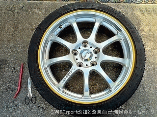 ・ノーマルタイヤ用のホイールに「ホイール リムガード リムプロテクター」を取付しました。 LYZER RIMBLADES WHEEL RIMGUARD[RM-0006]と同じ商品ですが、価格が1/3の商品です。 プライマーと脱脂用のアルコールは付属されていません。 購入時に見た販売ページの写真の色が明るめの黄色だったので購入しました。 実際の商品を見ると、ちょっとくすんだ感じの色です。 ボディーの色と同じ感じのイメージでしたが、ちょっとがっかりしました。